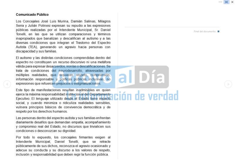 Fue previo a las disculpas que pidió Daniel Tonelli. Cuatro de los concejales repudiaron las expresiones del mandatario local.