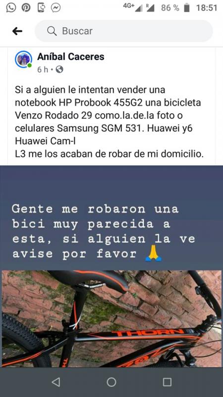 Una notebook HP Probook 455G2, una bicicleta Venzo Rodado 29’’, como la que se puede observar en la foto, celulares Samsung SGM 531, Huawei Y6, Huawei Cam - l