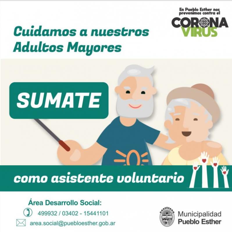 El Área de Desarrollo Social de la Municipalidad de Pueblo Esther convoca a la comunidad a sumarse como voluntario y/o voluntaria para asistir a los adultos mayores de 65 años en el marco de la emergencia sanitaria.