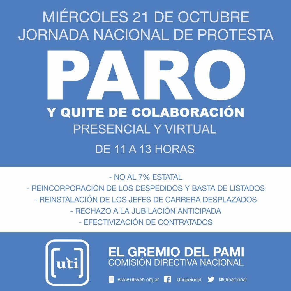 Este miércoles 21 de octubre, en todas las delegaciones del PAMI del país, se realizó un quite de colaboración de dos horas entre las 11 y las 13 en reclamo de mejoras en sus salarios.