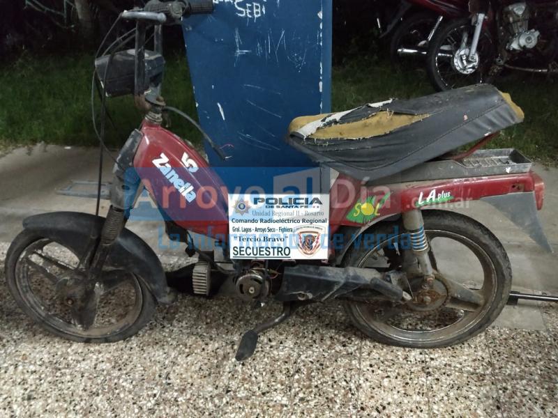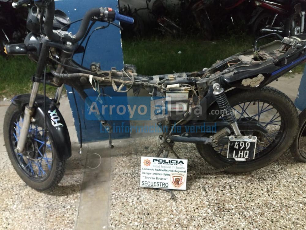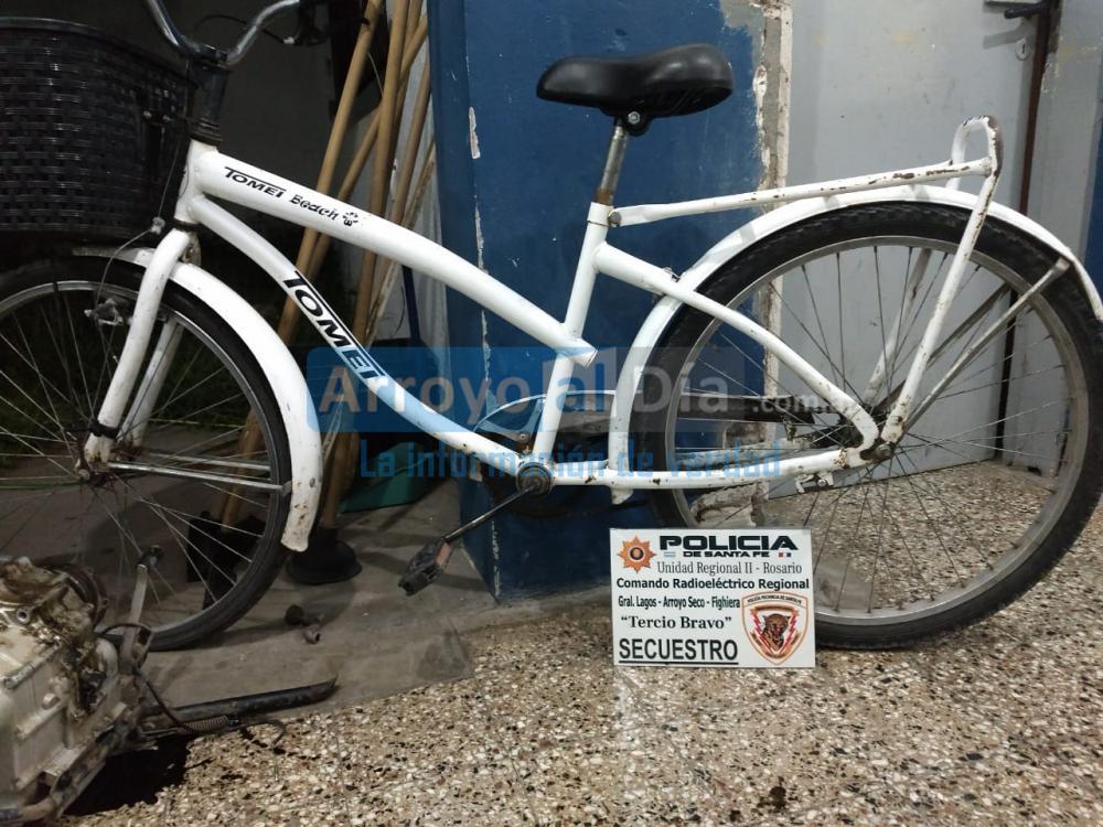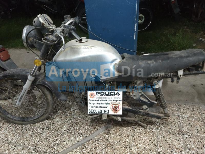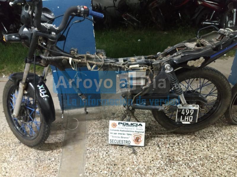 Al ingresar pudieron constatar que la motocicleta robada estaba allí, semidesarmada pero que se pudo individualizar por el dominio que todavía estaba en el cuadro. En el mismo lugar había otras dos motos en la misma condición, una bicicleta blanca del tipo mujer, un capacho y un cajón de madera donde había motopartes.