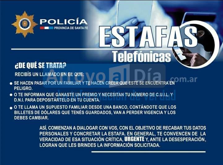 Se refirió también a las estafas telefónicas, que generalmente los utilizan con personas mayores asustándolas con accidentes o secuestros de familiares: "Si no pueden con este tipo de estafas, utilizan los teléfonos para delinquir asustando, poniendo nervioso a quien atiende el teléfono y que juegan con la desesperación de quien termina atendiendo el teléfono. Lo que recomendamos es que se corte la comunicación y que se ponga en contacto con la persona de la cual dicen tuvo ese inconveniente para cerciorarse de que sea verdad y que no entreguen nada ni tampoco salgan a la puerta de la casa. Si la persona está en peligro va a volver a llamar y si es un intento de estafa, no va a volver a llamar".