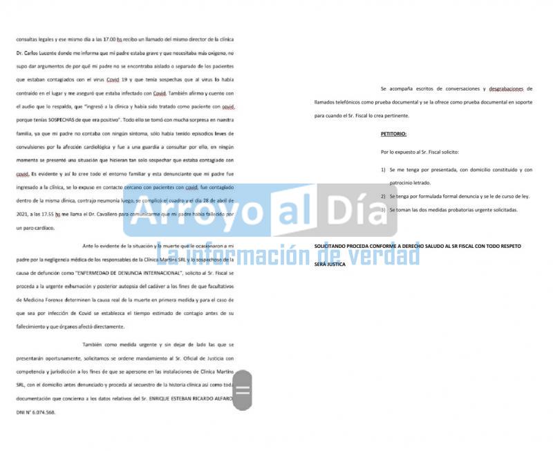 Arroyo Al Día consultó al patrocinante de la familia Alfaro, el Dr. Fernando Zárate, quien relató el suceso: "Todo consta en la denuncia que pueden ver. El paciente Alfaro llega a la clínica por una patología que padecía y por la cual se le atendía desde hacía tiempo y que con un tratamiento leve se podía solucionar. En la clínica surgieron contradicciones entre los médicos que lo atendían, ya que unos afirmaban que tenía síntomas de Covid, otros no lo podían afirmar, algo que pudimos corroborar con los audios de los médicos.