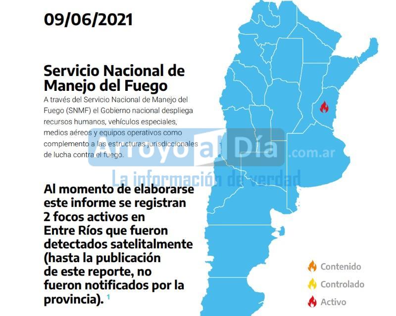 El Servicio Nacional del Manejo del fuego (SNMF) informó este miércoles que registró dos incendios forestales activos en Entre Ríos.