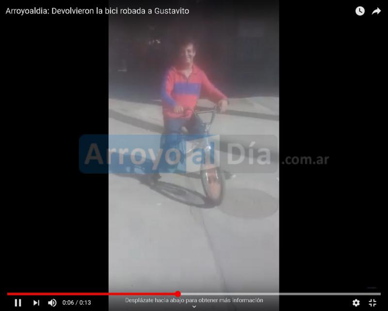 Gustavito, el chico con capacidades diferentes, al que le hab铆an sustra铆do hace algunas noches su bicicleta delante de un negocio cercano a su domicilio, pudo reencontrarse con ella gracias a que una mujer se comunic贸 con alguien cercano y dispuso que un chico se la entregase. Del mismo no se conoce la filiaci贸n ni tampoco si la adquiri贸, la encontr贸 o era parte de quienes se la hab铆an llevado.