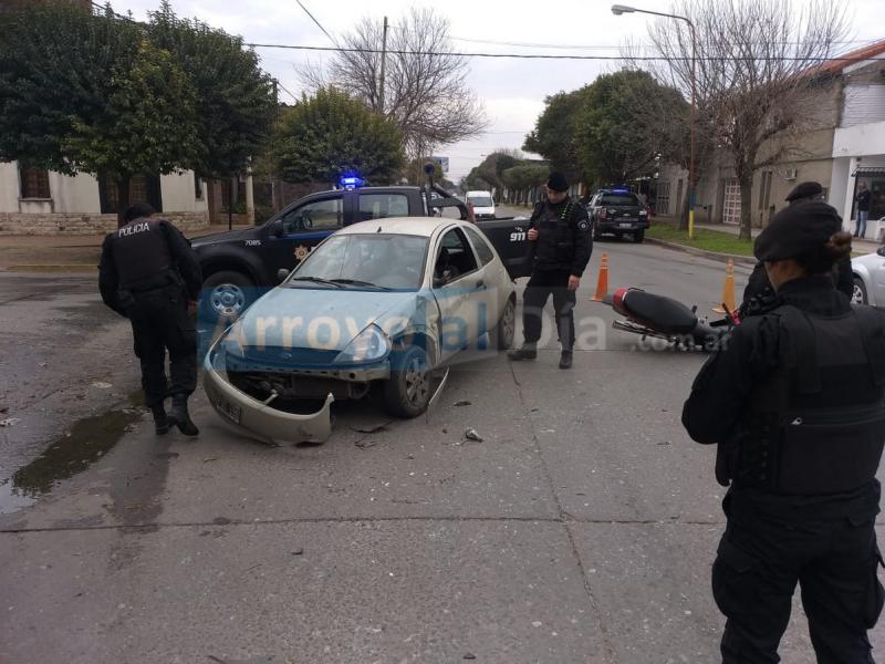 En horas de la tarde de hoy, personal del CREAS divisa una moto marca Keller de 110 cc de color roja y negra sin dominio que circulaba en contramano. Al intentar detenerla, su conductor, que resultó ser menor de edad al igual que su acompañante, huye y en su recorrido colisiona a un Ford Ka en la intersección de calles Libertad y Rivadavia.