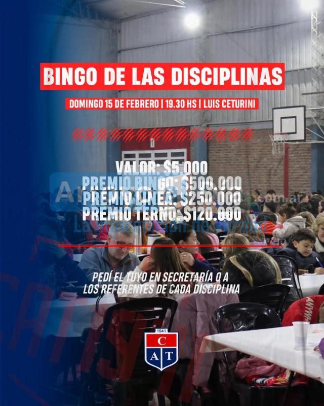 El próximo domingo 15 de febrero, a partir de las 19.30 horas, se llevará a cabo el Bingo de las disciplinas en la cancha de fútbol del club, una propuesta abierta a la comunidad para colaborar con la institución.