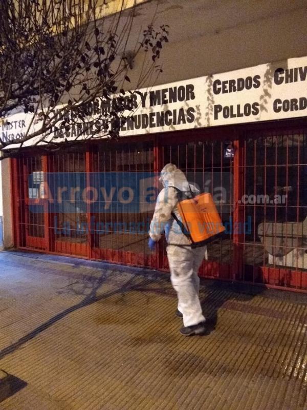 Personal del área, intensifica las tareas de desinfección en espacios como las inmediaciones de los bancos, comercios, paradas de colectivos y demás lugares donde suelen agruparse vecin@s para ejecutar diversos trámites, realizar compras, etc.