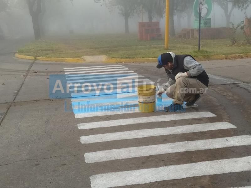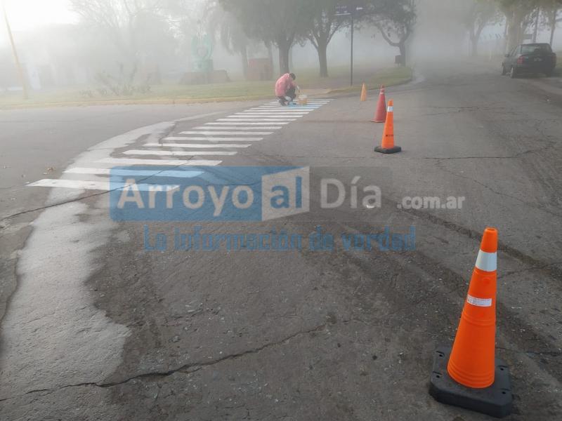Una cuadrilla del área, se desempeña en la renovación de las sendas peatonales, desarrollando las tareas de señalizacion vial que se extenderán en toda la ciudad.