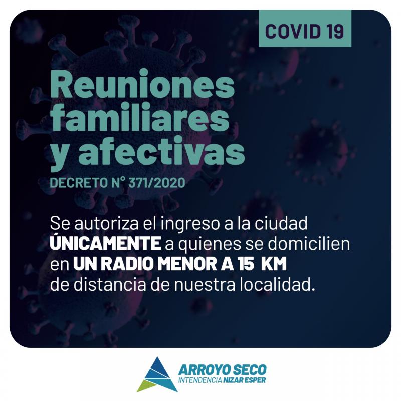 Se dispone autorizar únicamente el ingreso a la ciudad de Arroyo Seco a los fines de las reuniones familiares y/o afectivas dispuestas por Decreto del Poder Ejecutivo Municipal Nro. 363/2020, a quienes se domicilien en un radio menor a quince (15) km de distancia de nuestra localidad.