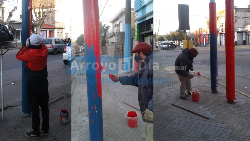 Cuadrillas de trabajadores del sector, avanzan con estos trabajos en las columnas de alumbrado de calle San Martín, en pleno centro de la ciudad.