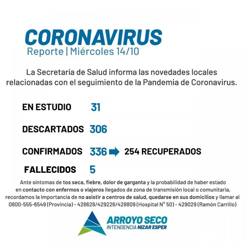 Por consiguiente, comunicamos que desde el último parte hasta el cierre del día de ayer, miércoles 13 de octubre, se sumaron 20 nuevos casos positivos de Covid-19.