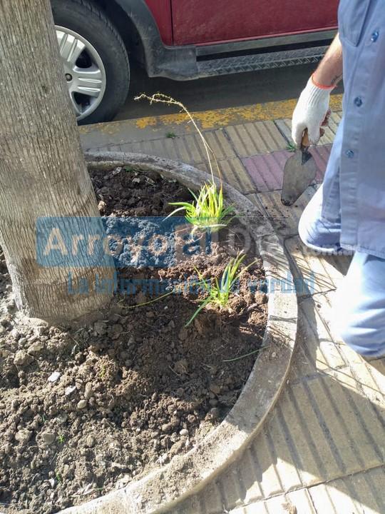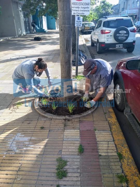 Por consiguiente, se desarrollaba la limpieza de canteros y se procedía a la colocación de plantines de Bulbines en las veredas del Palacio Municipal.