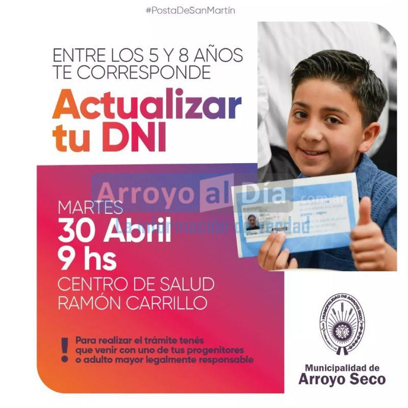 La municipalidad informó que el próximo martes 30 de abril, a las 9:00, en el Centro de Salud "Ramón Carrillo", desde el área de Desarrollo Social de la gestión y junto al Registro Civil local, se realizará un operativo para la actualización de DNI.