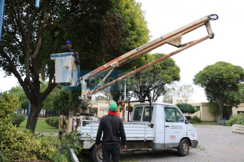 Una cuadrilla congrega estas tareas precisas que amalgaman múltiples beneficios, tales como brindar mayor luminosidad al espacio con la liberación de las ramas, atacando también la problemática que generan los desechos de las aves, brindando además ventajas sobre el crecimiento y renovación del arbolado emplazado en ese sector.