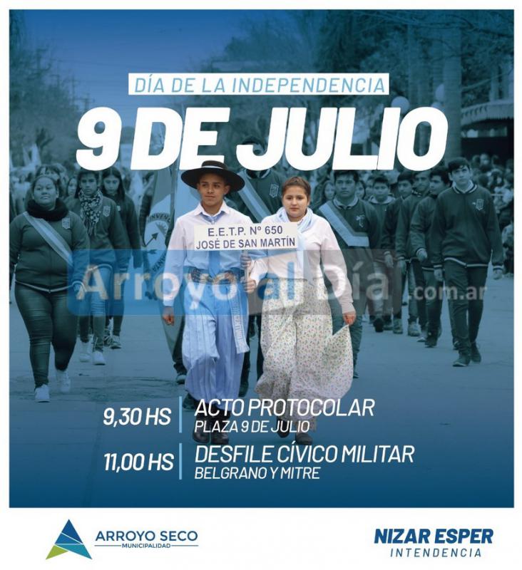 Primeramente, desde las 09:30hs, se llevará a cabo el Acto Protocolar en la plaza 9 de julio. Seguidamente, a partir de las 11:00hs, todas las instituciones que residen y ejecutan sus actividades en Arroyo Seco y la región formarán parte del clásico Desfile Cívico - Militar que tendrá como epicentro las inmediaciones de las calles Belgrano y Mitre, acaparando la atención de tod@s los presentes, siendo un estandarte solemne de nuestra celebración patria.