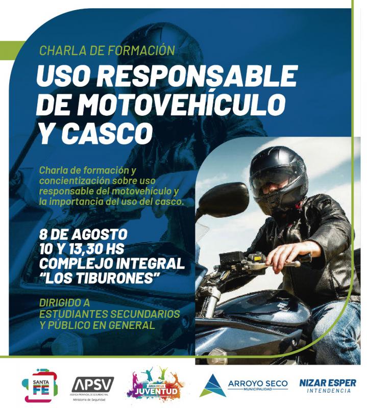 La actual gestión municipal, el jueves 8 de agosto en el Complejo Integral "Los Tiburones", se efectuará una charla de formación y concientización sobre uso responsable del motovehículo y la importancia del casco; dirigida principalmente a estudiantes secundarios y también al público en general.