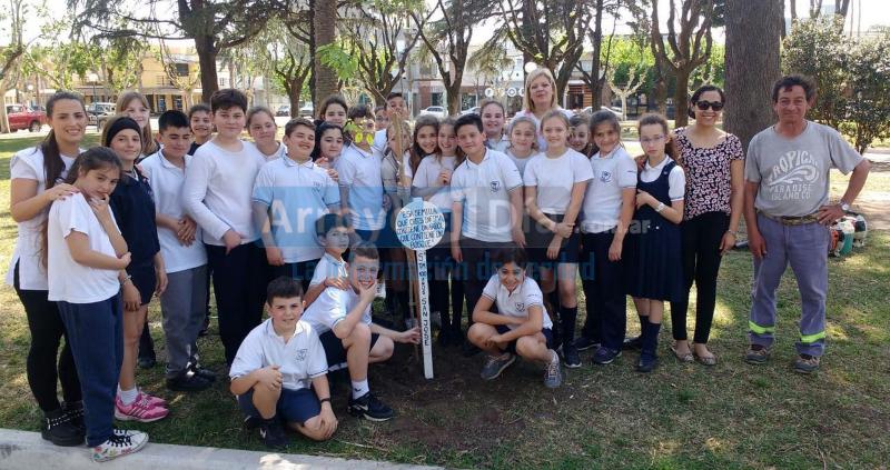 Pequeñ@s estudiantes del Colegio "San José" junto a sus docentes, participaron de la plantación de un árbol en la Plaza 9 de julio.