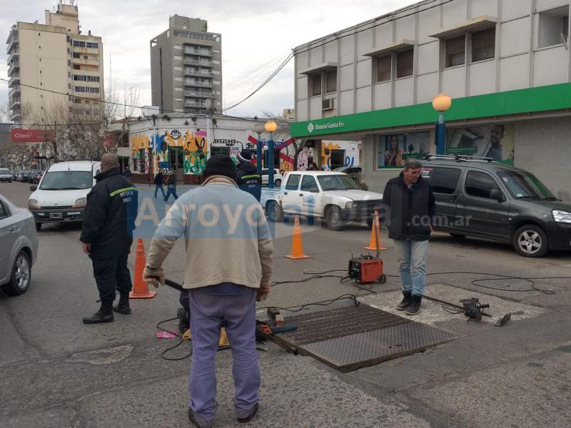 Congregando otro de los frentes de trabajo dispuestos por la actual gestión municipal, mediante personal de la Secretaría de Obras y Servicios Públicos, se realizaban tareas de reparación en la red de desagües cloacales con base en la intersección de las calles Rivadavia y 9 de julio.