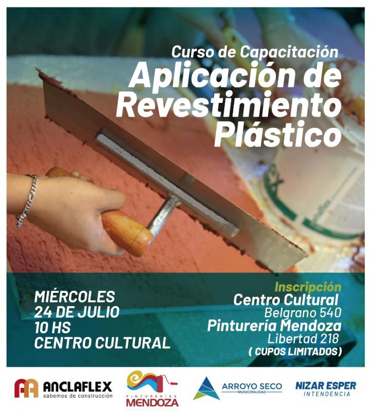 Municipio invita a la población a este curso referido a la capacitación para la aplicación de revestimiento plástico a desarrollarse el miércoles 24 de julio desde las 10:00hs en el Centro Cultural "Guillermo Furlong".
