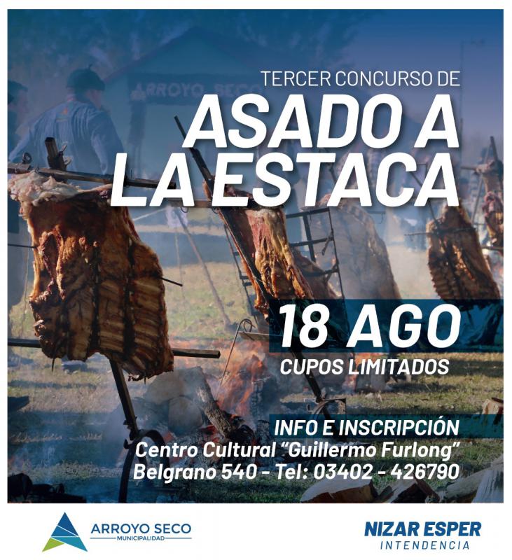 Desde el área de Cultura, Deportes y Educación, invitamos a aquellos vecinos que se encuentren interesados en formar parte del “3º Concurso de Asado a la Estaca”, a realizarse el próximo domingo 18 de agosto en nuestra ciudad.