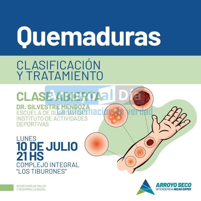 La Municipalidad de Arroyo Seco, por medio de la Secretaría de Salud y Desarrollo Social, de la mano del programa provincial "Santa Fe Capacita", invita a la población para este próximo lunes 10 de julio, a participar de una nueva clase abierta sobre "Quemaduras: Clasificación y Tratamiento".