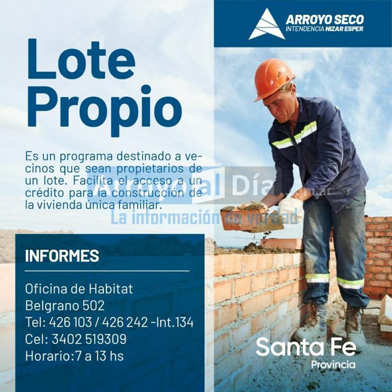 La Municipalidad de Arroyo Seco, mediante la Dirección de Hábitat local, informa a la población, dentro de los alcances del programa provincial "Lote Propio", que hay tiempo como plazo máximo hasta el 31 del corriente mes para la presentación de la documentación correspondiente.
