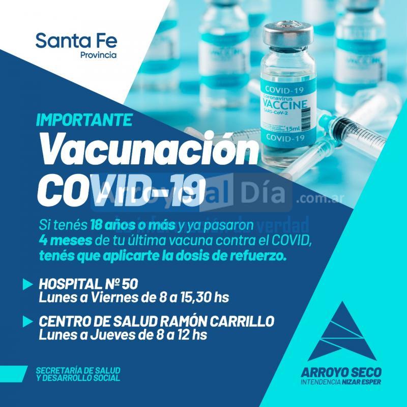 La Municipalidad de Arroyo Seco, por intermedio de la Secretaría de Salud y Desarrollo Social, informa la continuidad del proceso de vacunación contra el Covid-19.