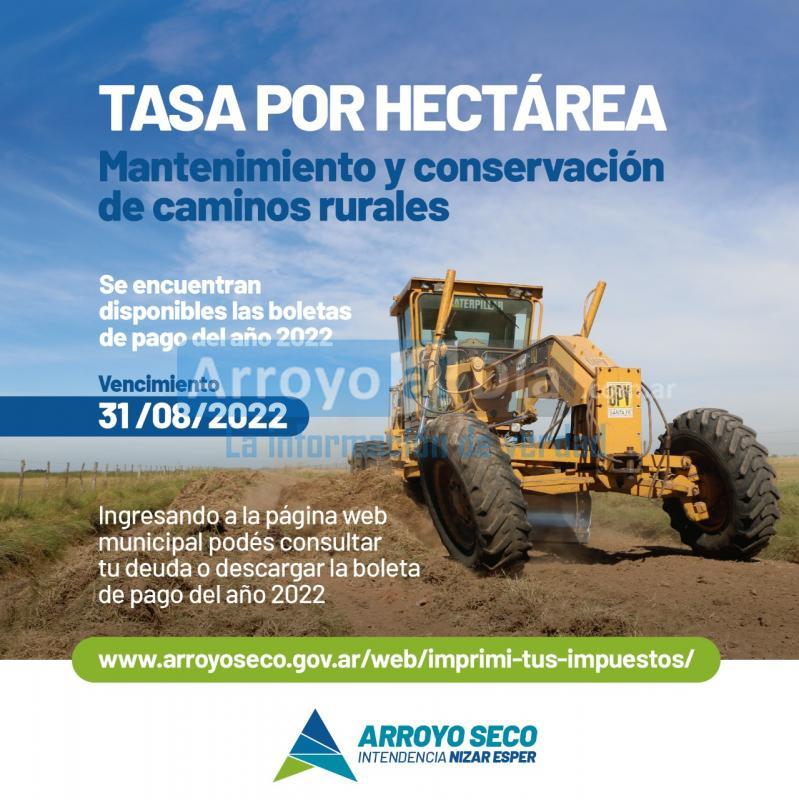 La Municipalidad de Arroyo Seco informa que se encuentran disponibles las boletas de pago del año 2022 correspondiente a la Tasa por Hectárea para mantenimiento y conservación de caminos rurales.