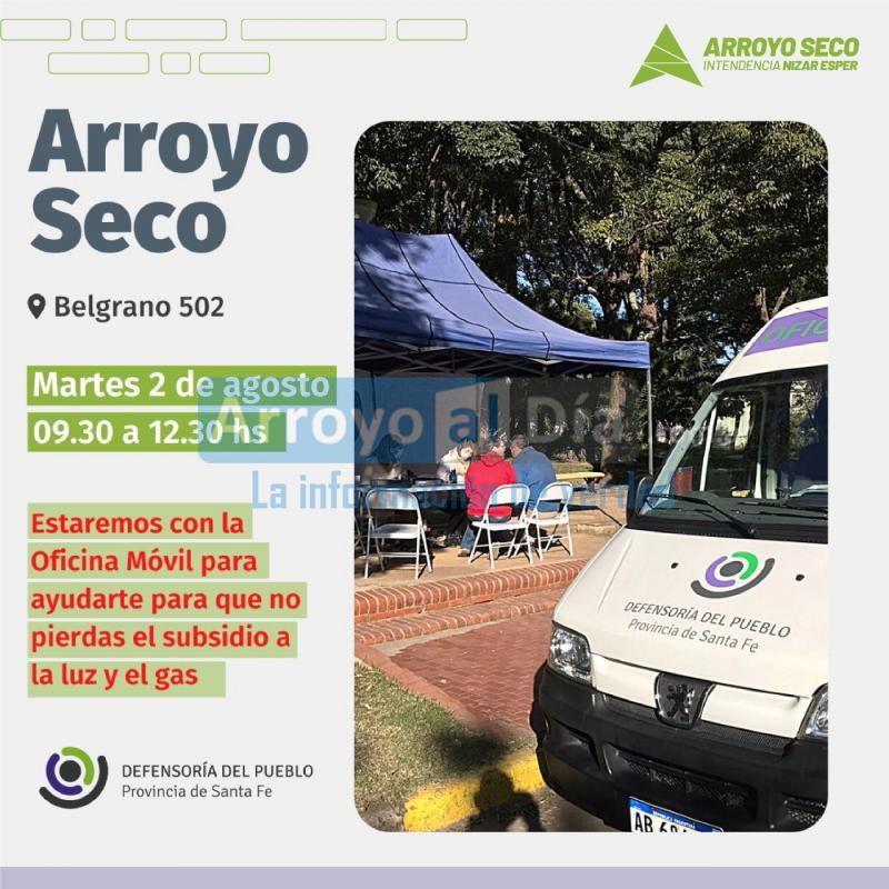 La Municipalidad de Arroyo Seco informa que el próximo martes 2 de agosto, frente al Palacio Municipal sobre calle Belgrano 502, desde las 09:39 hasta las 12:30hs dirá presente nuevamente en la localidad la Oficina Móvil de la Defensoría del Pueblo.