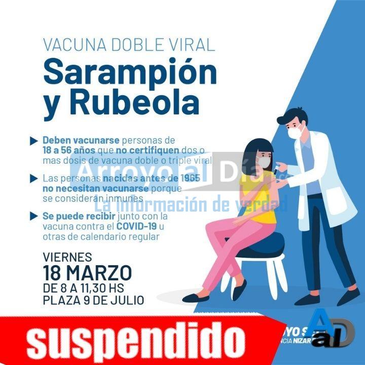 La Municipalidad de Arroyo Seco y el SAMCO N°50, informan que debido a las condiciones climáticas adversas se suspendió la realización de la campaña de vacunación Doble Viral: Sarampión y Rubeola en la plaza 9 de julio.