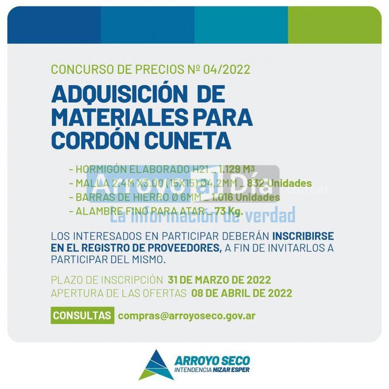 La Municipalidad de Arroyo Seco, en el marco de la Ordenanza nº 3019/21, convoca a los interesados en participar del Concurso de Precios Nº 04/2022 a inscribirse en el registro de proveedores, a fin de invitarlos a participar del mismo.