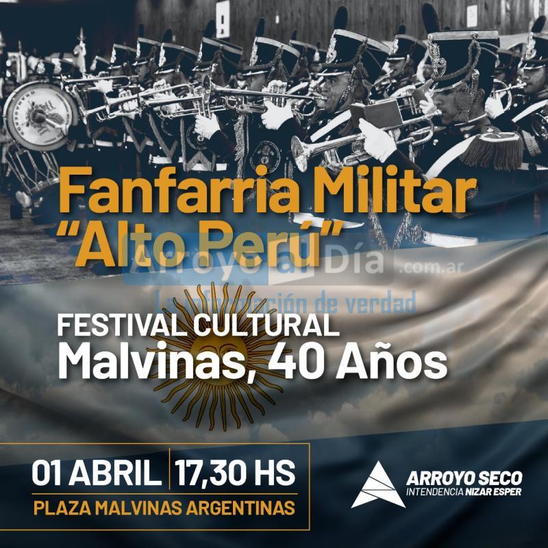 En el marco del Festival Cultural en la vigilia de Malvinas, 40 años, que se desarrollará el próximo 1° de abril a partir de las 17:30hs, la Municipalidad de Arroyo Seco mediante la Secretaría de Cultura, Deportes y Educación, informan que en el encuentro se presentará la Fanfarrias Militar Alto Perú, acoplándose a las acciones conmemorativas por la histórica gesta gesta que cumplirá un nuevo aniversario el próximo sábado.