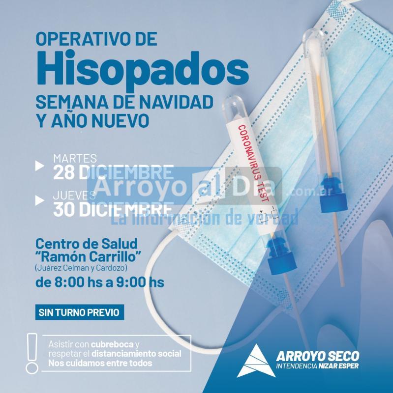 La Municipalidad de Arroyo Seco por medio de la Secretaría de Salud y Desarrollo Social, informa a la población que para la semana Año Nuevo se realizará el Operativo de Hisopados en el Centro de Salud Ramón Carrillo.
