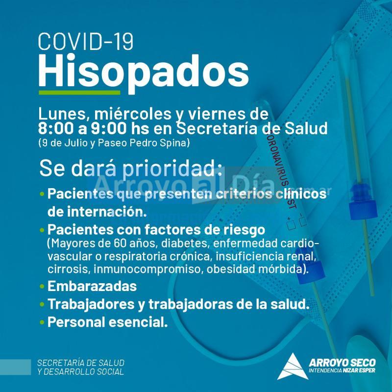 La Municipalidad de Arroyo Seco recuerda, mediante la Secretaría de Salud y Desarrollo Social, la dinámica de hisopados para detectar el Covid-19.