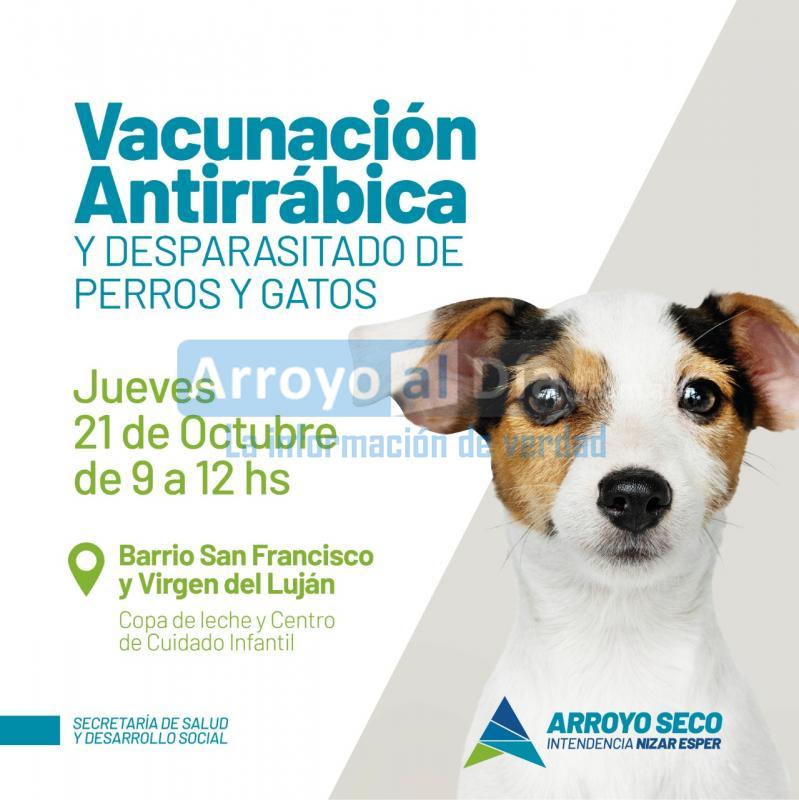 La Municipalidad de Arroyo Seco informa, por intermedio de la Secretaría de Salud y Desarrollo Social, que el jueves 21 de octubre se procederá a una jornada de vacunación antirrábica y desparacitado de perros y gatos.