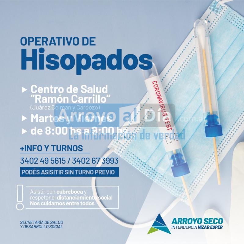 La Municipalidad de Arroyo Seco por medio de la Secretaría de Salud y Desarrollo Social, informa a la población que el Operativo De Hisopados Diarios, continúa en el Centro de Salud Ramón Carrillo con el fin de detectar y frenar tempranamente los contagios de Covid-19.