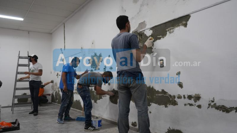 Los participantes del taller de Pintura y reparación de paredes con salida laboral del programa Santa Fe Más, realizan trabajos de esta índole en la estructura interna del Centro Cultural Guillermo Furlong, aplicando lo aprendido en esta propuesta de inclusión que apunta a la restitución de los derechos de los jóvenes.
