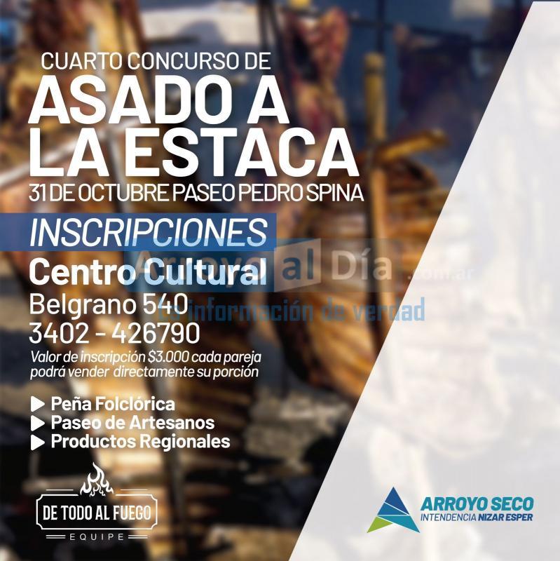 La Municipalidad de Arroyo Seco mediante la Secretaría de Cultura, Deportes y Educación junto a De Todo al Fuego Equipe, informa que el próximo 31 de octubre de realizará en el Boulevard Paseo Intendente Pedro Spina el 4° Concurso de Asado a la Estaca en nuestra localidad.