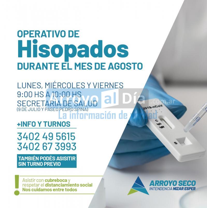 La Municipalidad de Arroyo Seco por medio de la Secretaría de Salud y Desarrollo Social, informa a la población que el Operativo de Hisopados, continuará en el mes de agosto con el fin de detectar y frenar tempranamente los contagios de Covid-19.
