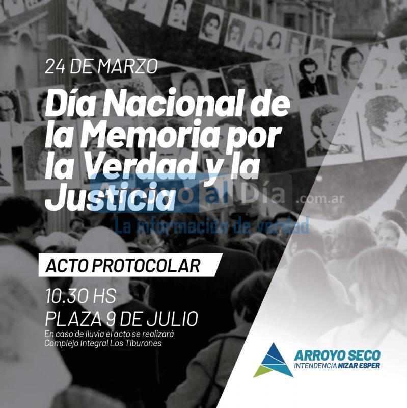 La Municipalidad de Arroyo Seco, invita a participar al acto protocolar por el 24 de marzo, Día Nacional de la Memoria, por la Verdad y la Justicia.
