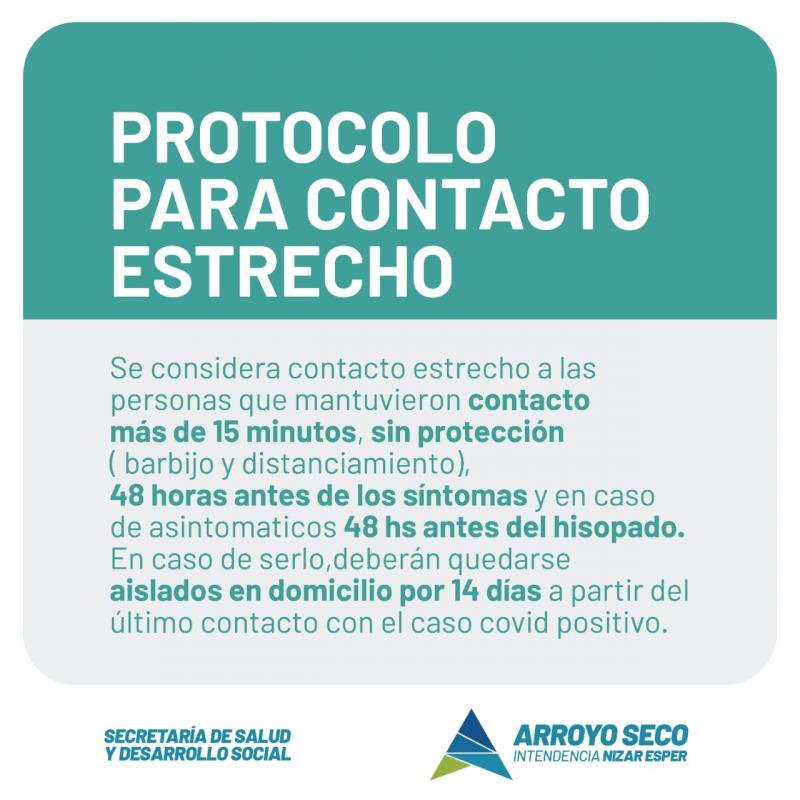 La Municipalidad de Arroyo Seco, mediante la Secretaría de Salud y Desarrollo Social, informa a la comunidad los pasos y protocolos a seguir en el caso de tener un contacto estrecho con un caso confirmado de Covid-19.
