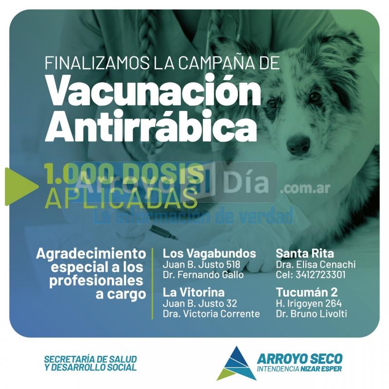 La Municipalidad de Arroyo Seco, informa a la comunidad que el pasado lunes 27 de julio finalizó la campaña de vacunación antirrábica gratuita llevada a cabo por profesionales de la ciudad, a través de la Secretaría de Salud y Desarrollo Social local.
