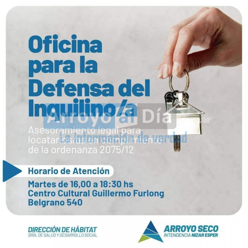 La Municipalidad de Arroyo Seco, por medio de la Dirección de Hábitat dependiente de la Secretaría de Salud y Desarrollo Social, recuerda que todos los martes de 16:00hs a 18:30hs en el Centro Cultural "Guillermo Furlong" (Belgrano 540), funciona la Oficina de Defensoría del Inquilino/a