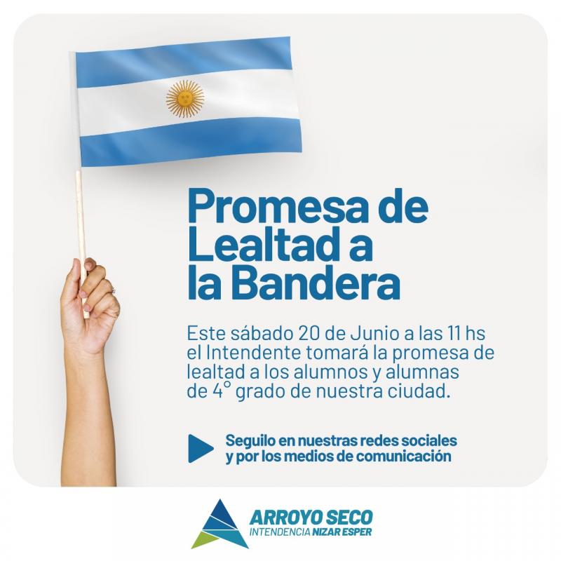 La Municipalidad de Arroyo Seco informa que, mañana, sábado 20 de junio en el marco del "Día de la Bandera", nuestro Intendente Nizar Esper tomará la promesa de lealtad al símbolo patrio a los alumnos y alumnas de 4° grado de las escuelas de nuestra ciudad.