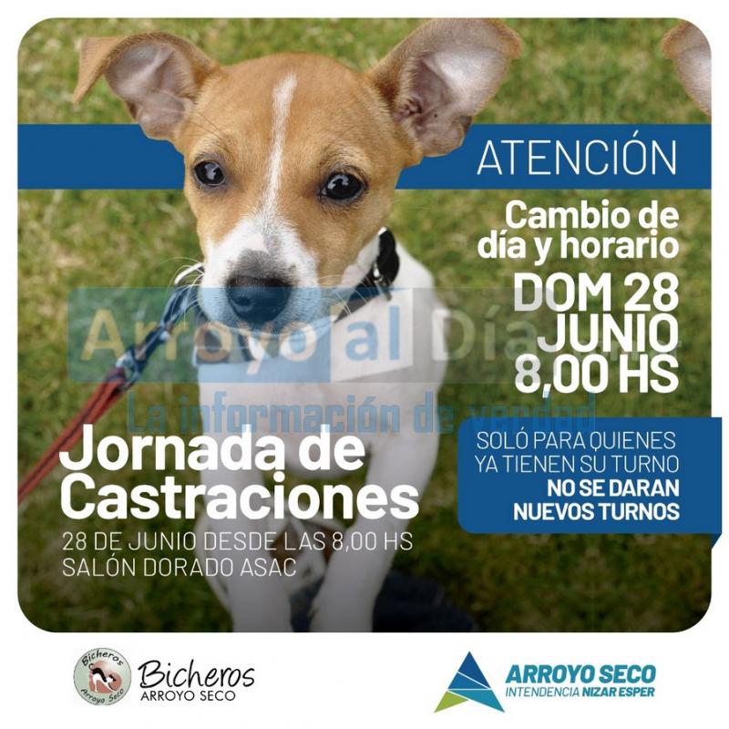 La Municipalidad de Arroyo Seco informa que el próximo jueves 25 de junio, se llevará a cabo una nueva jornada de castraciones gratuitas para perros y gatos en el "Salón Dorado" del Arroyo Seco Athletic Club (Lisandro de la Torre 155) a partir de las 15:00hs.