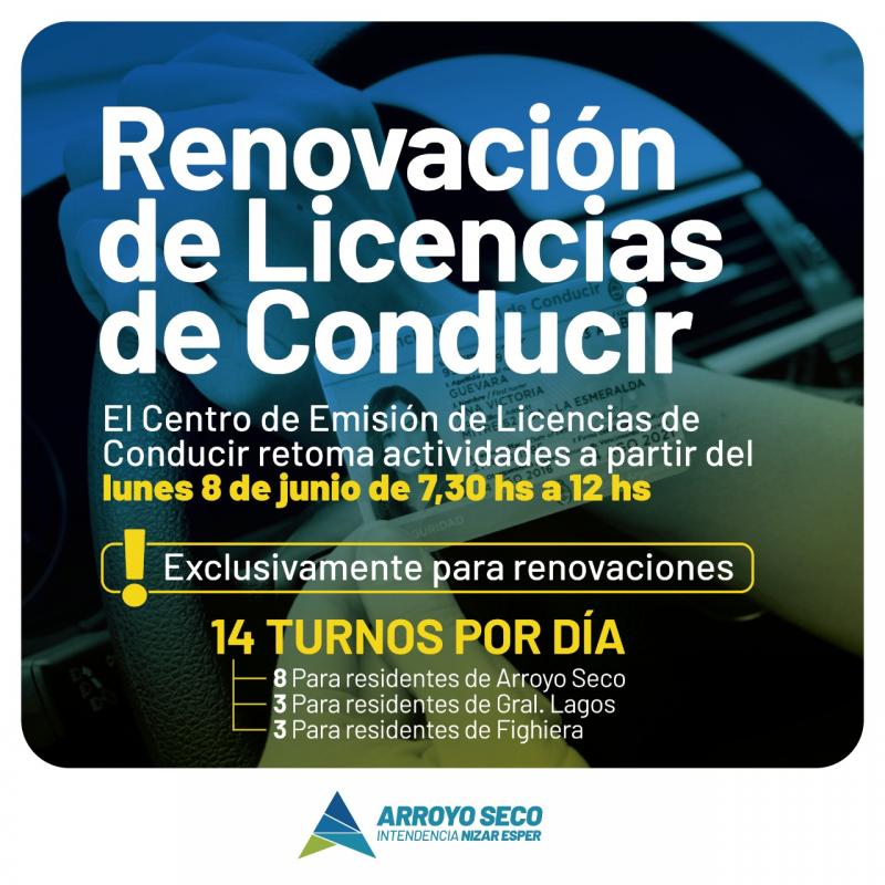 La Municipalidad de Arroyo Seco informa que tras el parate por la pandemia por COVID-19, las oficinas que corresponden al Centro de Emisión de Licencias de Conducir retomarán sus actividades.