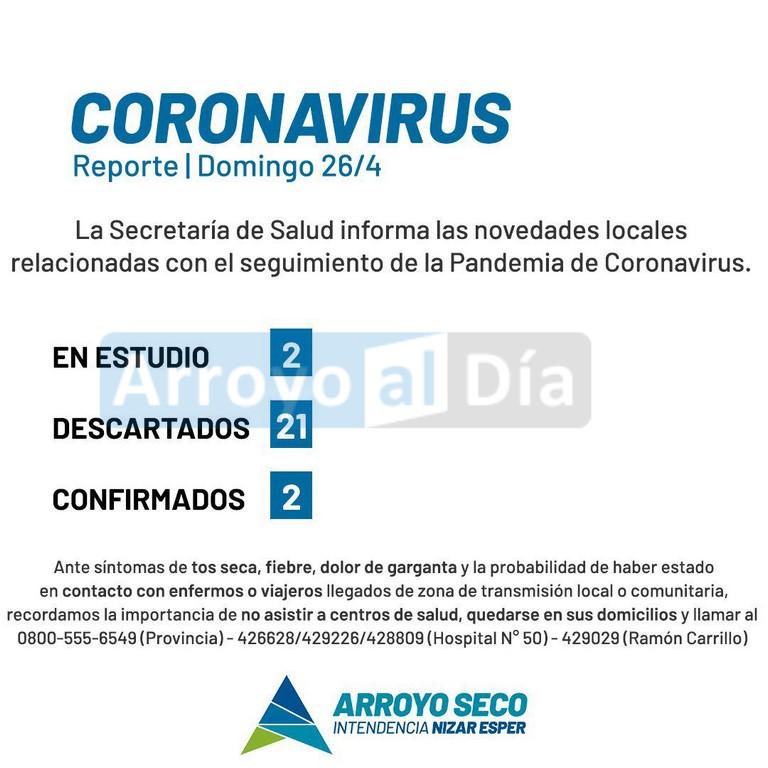 La Municipalidad de Arroyo Seco, mediante la Secretaría de Salud, informa las novedades locales relacionadas al seguimiento de la pandemia por el virus COVID-19.