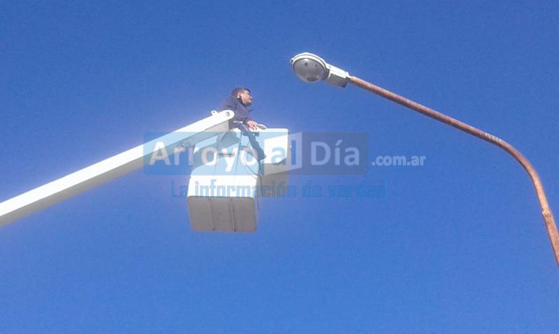 Empleados de la Secretaría de Obras y Servicios Públicos realizan el cambio y reparación de luminarias en toda la ciudad.