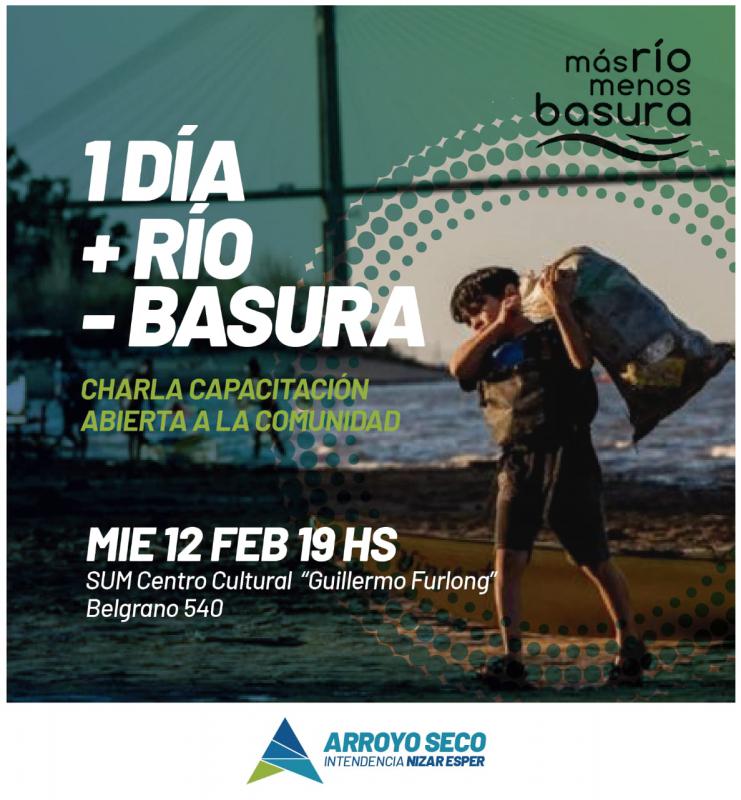 Desde el gobierno municipal de Arroyo Seco, impulsamos junto a la ONG de Rosario "+ Río - Basura" una charla capacitación abierta a toda la población referida a la limpieza de nuestras costas en el río Paraná. La iniciativa, se desarrollará el miércoles 12 de febrero a partir de las 19:00hs en el Salón de Usos Múltiples del Centro Cultural "Guillermo Furlong" (Belgrano 540).